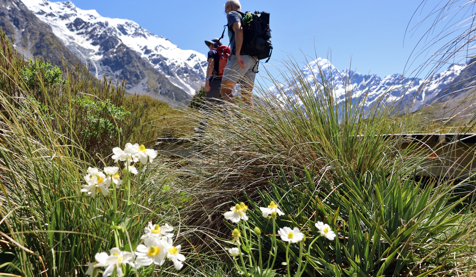 マウントクックを正面に見据えながら歩くことができるフッカーバレートラックのボードウォーク