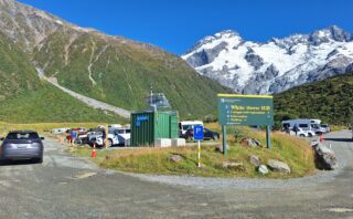 マウントクックのフッカーバレートラックやケアポイントをトレッキングで楽しもうと日帰りでレンタカーを利用してやって来る人が大変多くなってついにその駐車場が有料になりました。その有料駐車場の使い方と無料で駐車できる場所の情報を現地ガイドが紹介します。
